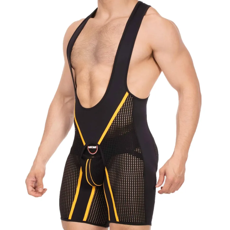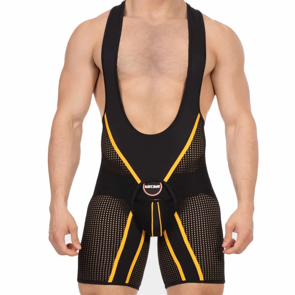 Body sexy et provocant combinant microfibre extensible et résille sport. Totalement ouvert devant et derrière pour un accès facile aux parties intimes (sous-vêtement en photo vendu séparément). Col en U plongeant révélant le torse. Détails de couleur contrastée. Logo Barcode en silicone dans le dos.