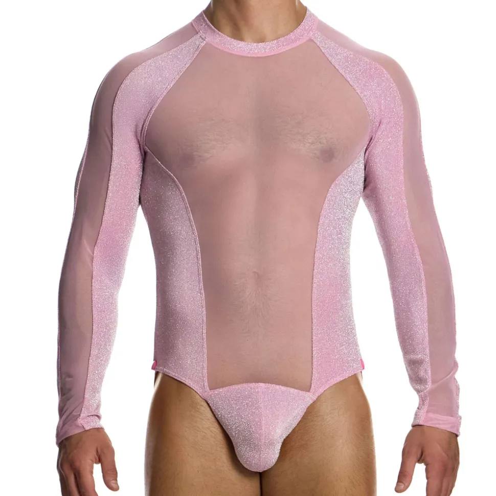 Body jock glamour combinant tulle transparent et microfibre tricotée avec des fils métallisés pour un effet pailleté scintillant. Manches longues et col rond. Les straps à l’arrière se détachent grâce à deux boutons pression. Etiquette Modus Vivendi argentée cousue en haut du dos.