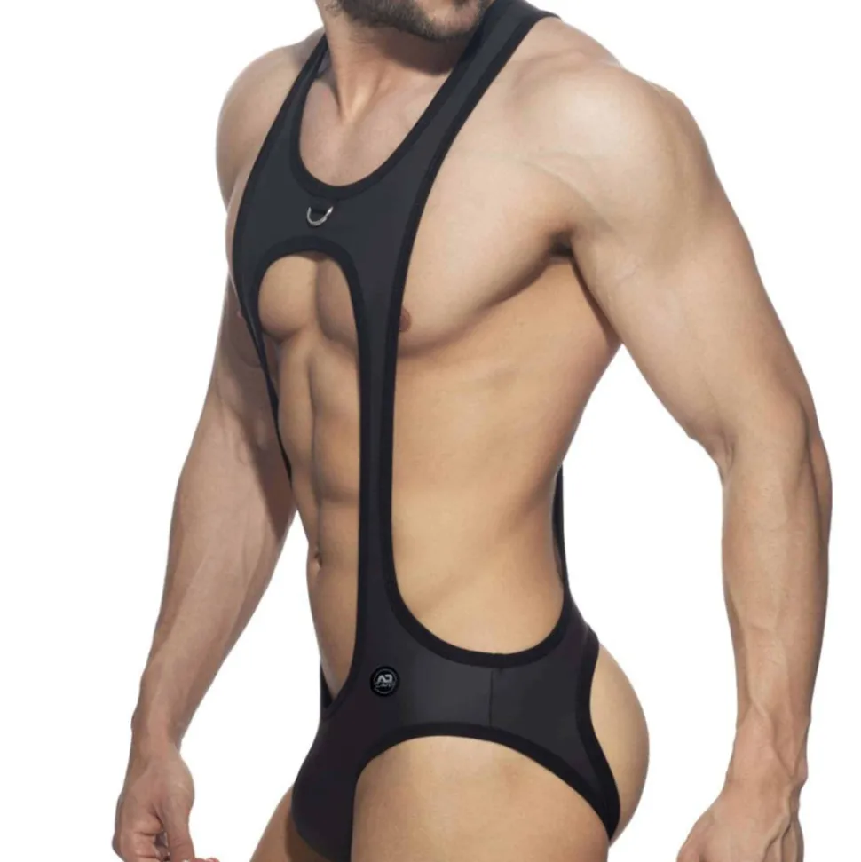 Body ultra sexy en microfibre extensible ayant l’aspect du latex. Coupe originale et provocante. L’arrière a été découpé pour une totale liberté de mouvement. Poche frontale non doublée. Anneau métallique sur la poitrine. Logo AD Party en silicone sur la hanche gauche.
