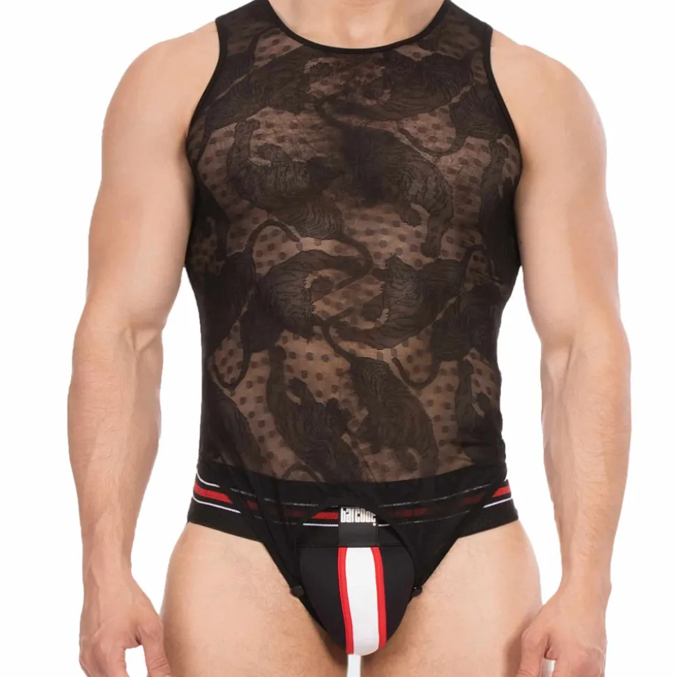 Body sexy et provocant en dentelle noire transparente à pois et motif tigre. Design original avec ses bandes élastiques fines (attachées devant par des boutons-pression) qui encerclent vos parties intimes, passent à l’entrejambe et dessinent comme un jockstrap sur les fesses. Logo Barcode en silicone dans le dos. Jockstrap en photo vendu séparément.