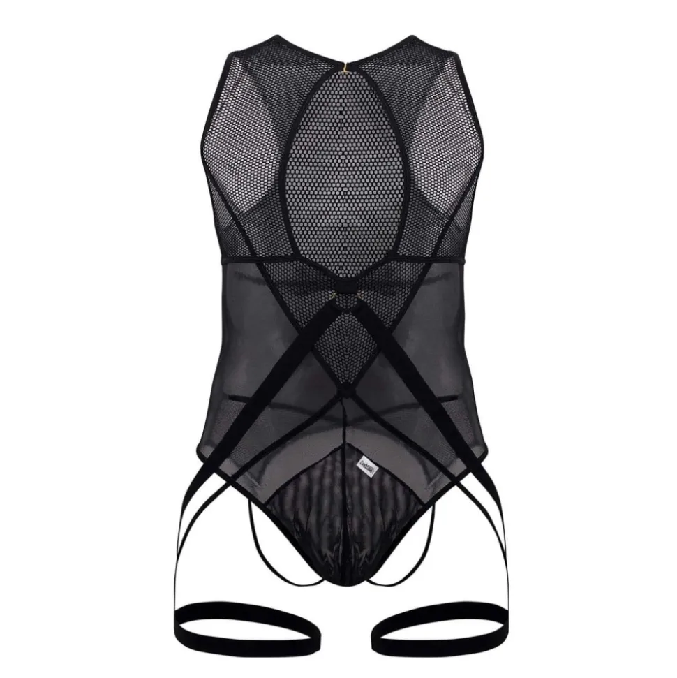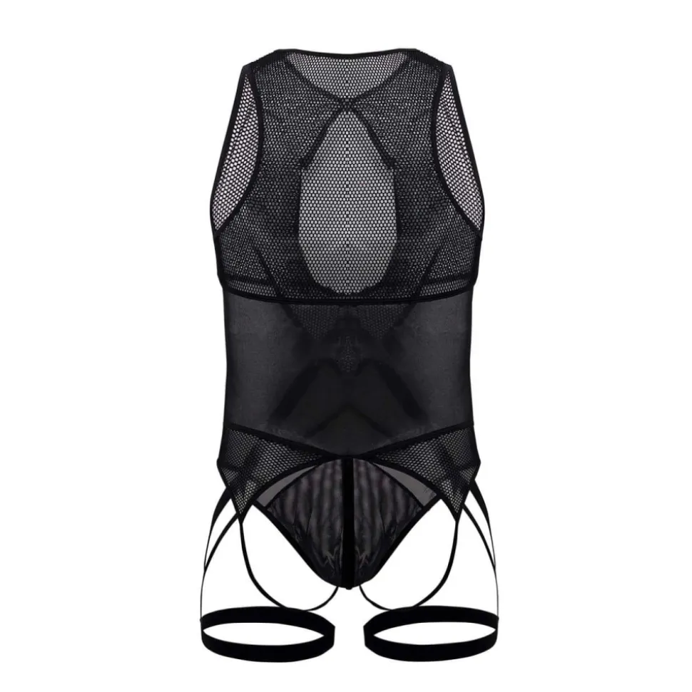 Ensemble comprenant un body string en résille transparente et une jarretière attachée par un anneau métallique. Poche frontale opaque. Crochet métallique sur la poitrine.