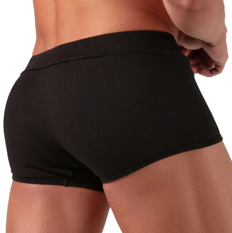 Boxer sexy en coton côtelé très doux et confortable. Laçage façon corset pour ouvrir la poche frontale. Ceinture élastique recouverte. Petite poche secrète. Fabrication française.