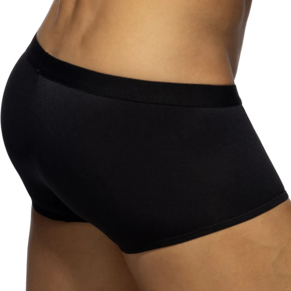 Boxer sexy en microfibre extensible, ultra douce et confortable, de couleur unie. Tissu recyclé à partir de bouteilles en plastique. Coupe super taille basse, minimaliste et très ajustée. Belle poche frontale préformée non doublée. Ceinture élastique fine signée AD.
