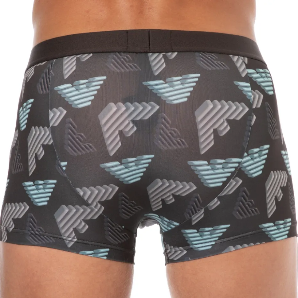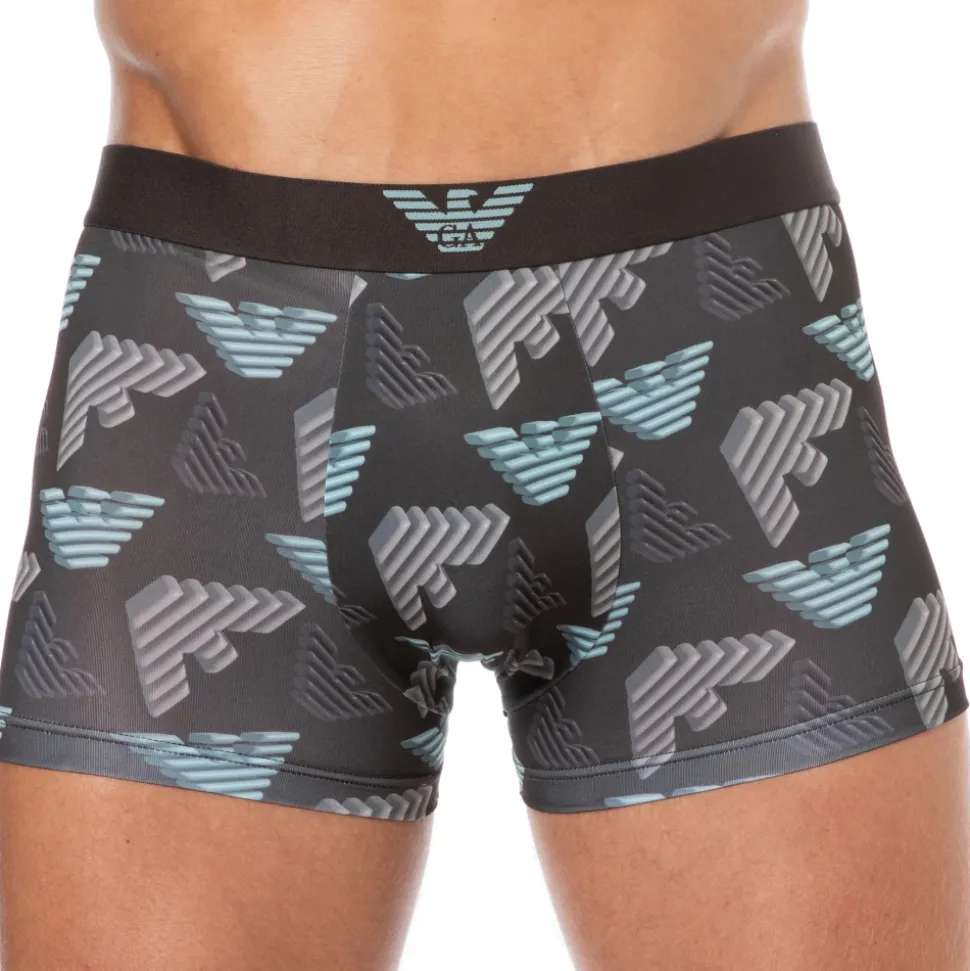 Boxer doux et confortable en microfibre. Matière recyclée séchant rapidement, réalisée dans le cadre du projet de durabilité d’Armani. Imprimé allover constitué d’aigles iconiques de la marque en 3D. Poche frontale doublée. Ceinture élastique signée Emporio Armani.
