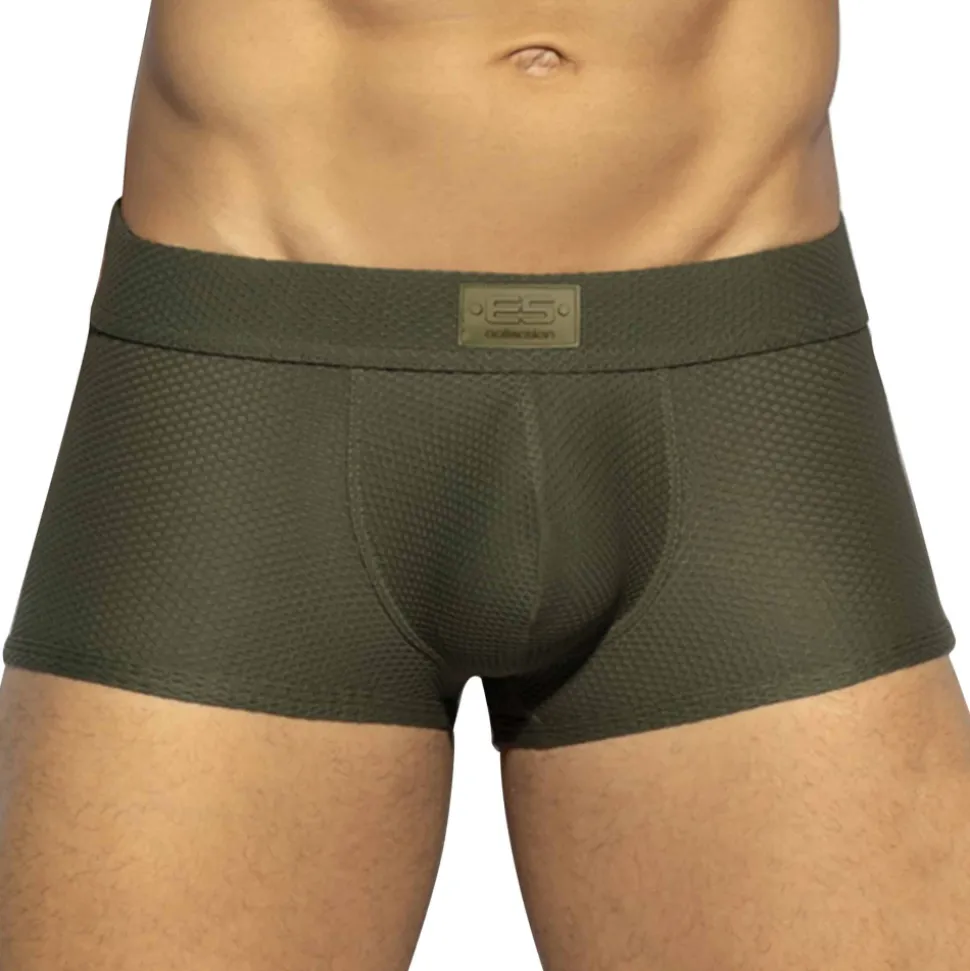 Boxer en mesh extensible, incroyablement doux et confortable. Tissu en relief façon nid d’abeille. Poche frontale de grande capacité. Logo ES en silicone cousu la ceinture élastique recouverte.