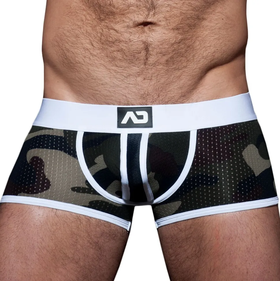 Boxer ultra sexy dont l’arrière a été découpé, à la manière d’un jockstrap, afin d’offrir une totale liberté de mouvement. Mesh ajouré imprimé d’un motif camouflage. Détails de couleur contrastée. Logo AD Fetish en silicone sur la ceinture élastique. Fabriqué à Barcelone.