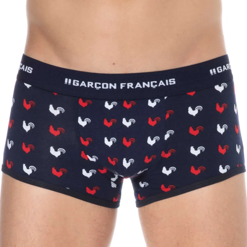 Boxer taille basse très ajusté en coton doux, souple et confortable. Imprimé coqs gaulois. Belle ceinture Garçon Français. Fabrication 100% française.