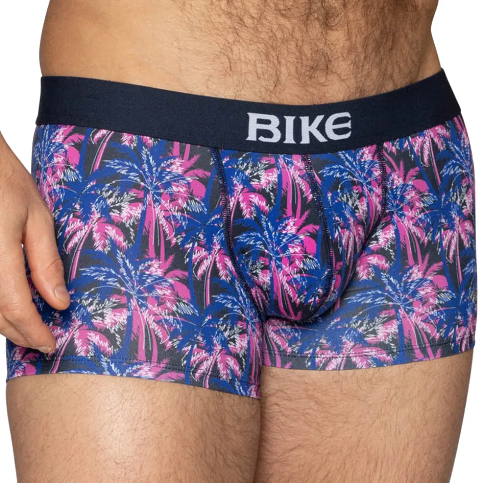 Boxer en coton extensible, doux et confortable. Motif palmiers dans les tons bleus et roses. Coupe taille basse et ajustée. Poche frontale doublée assurant un maintien ferme et confortable. Ceinture élastique signée BIKE.