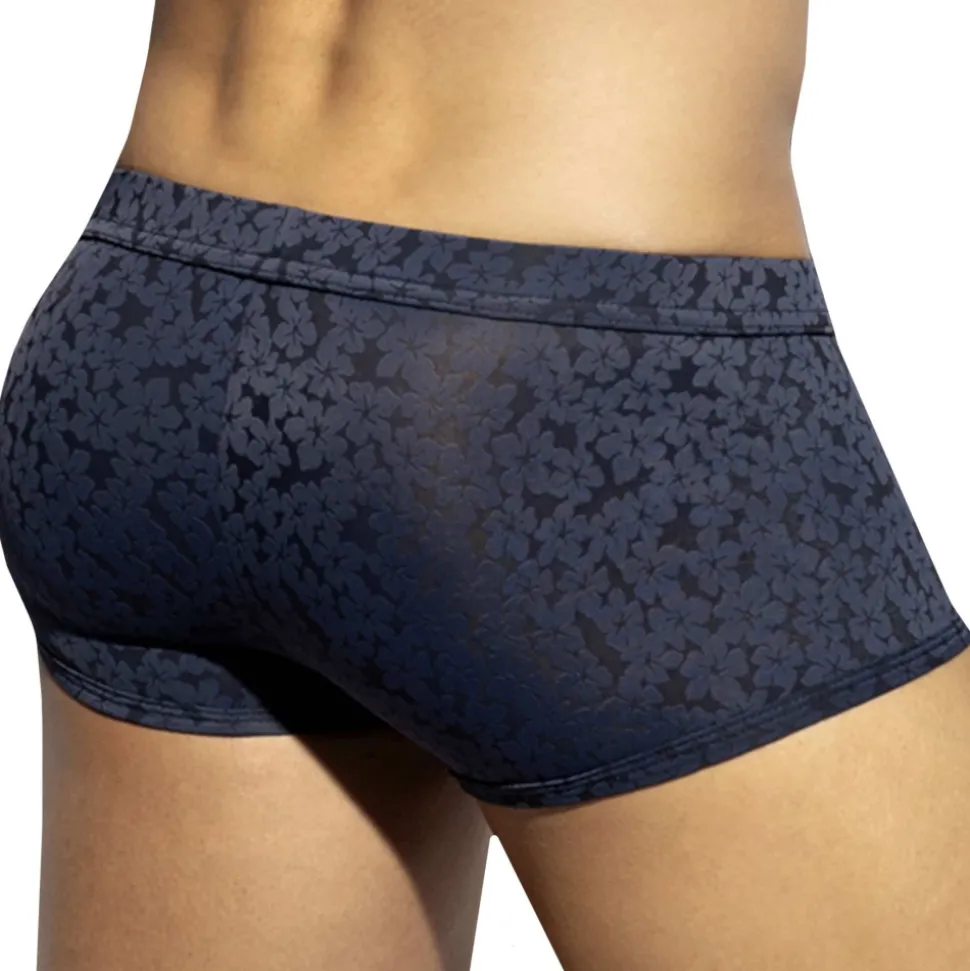 Boxer en voile extensible légèrement transparent. Motif floral discret et élégant façon dentelle. Coupe taille basse et ajustée. Ceinture élastique signée ES Collection.