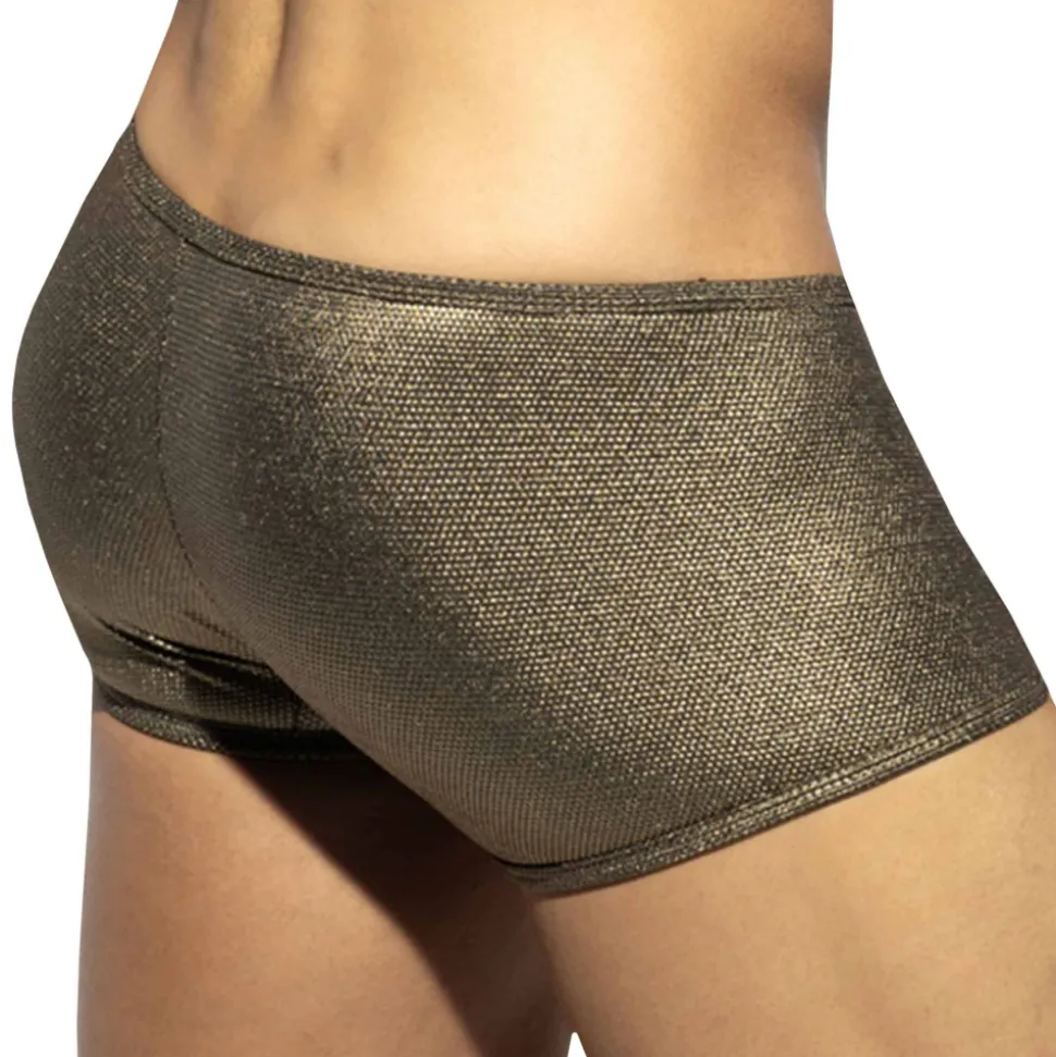Boxer luxueux en microfibre métallisée brillante. Tissu recyclé, extensible, doux et confortable. Bordures élastiquées. Coupe taille basse ajustée. Etiquette ES Collection en silicone sur la cuisse gauche.