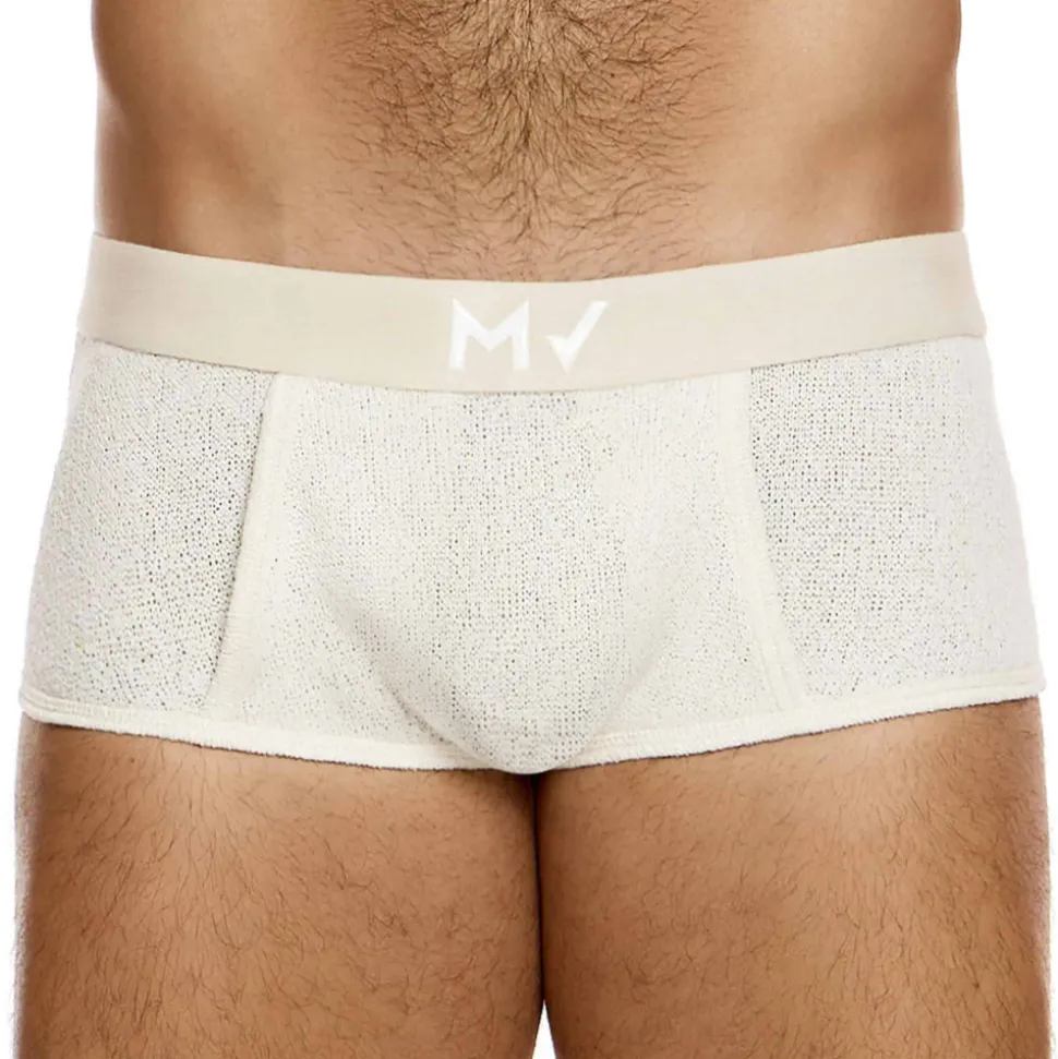 Boxer monochrome en maille tricotée fine, qui laisse légèrement entrevoir le corps en transparence. Coupe taille basse ajustée. Poche frontale doublée avec ouvertures sur les cotés pour un accès direct aux parties intimes. Ceinture élastique signée MV.