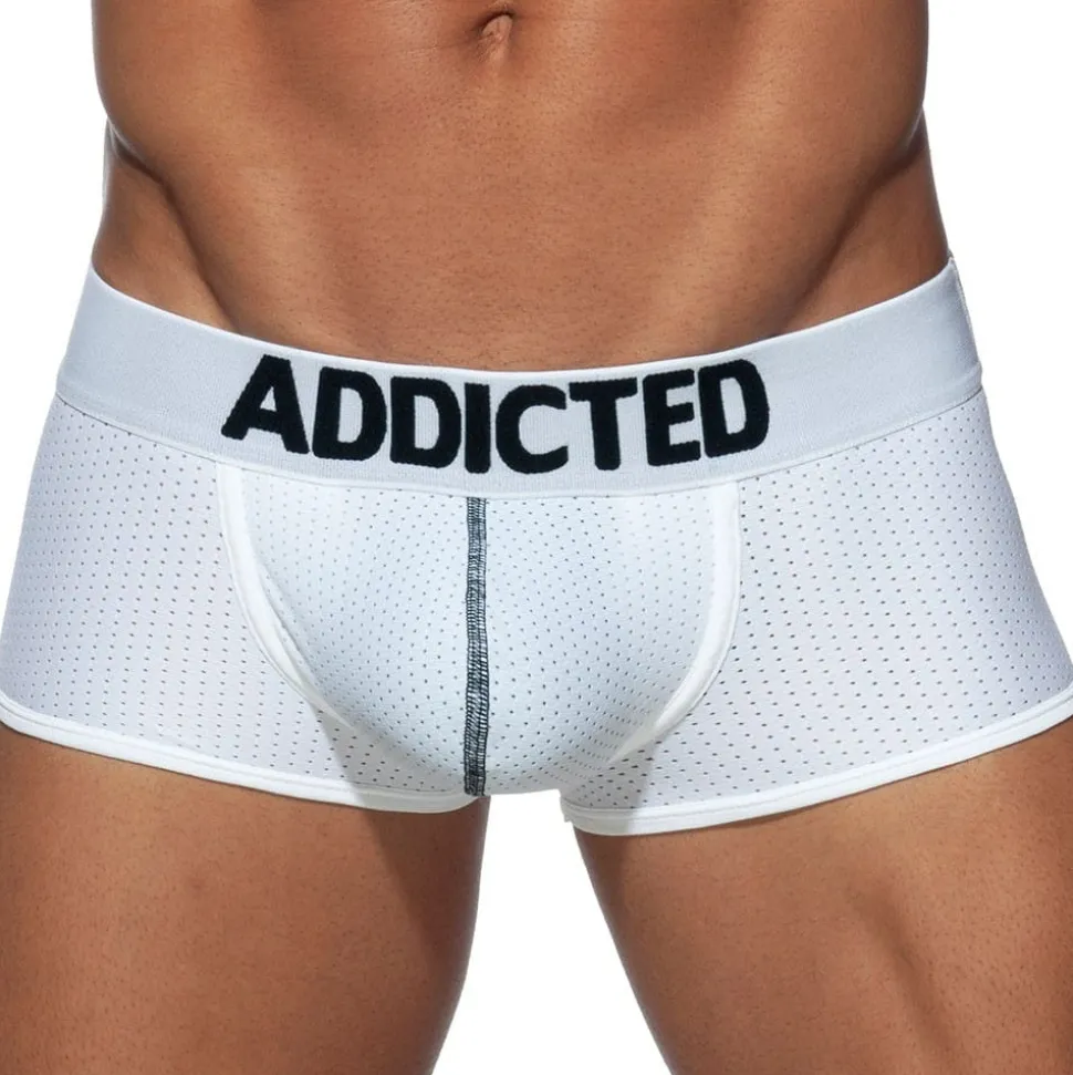 Boxer de couleur unie en mesh respirant, léger et confortable. Poche frontale push up extra-large pour un excellent maintien et une valorisation naturelle de votre masculinité. Ceinture élastique signée Addicted.