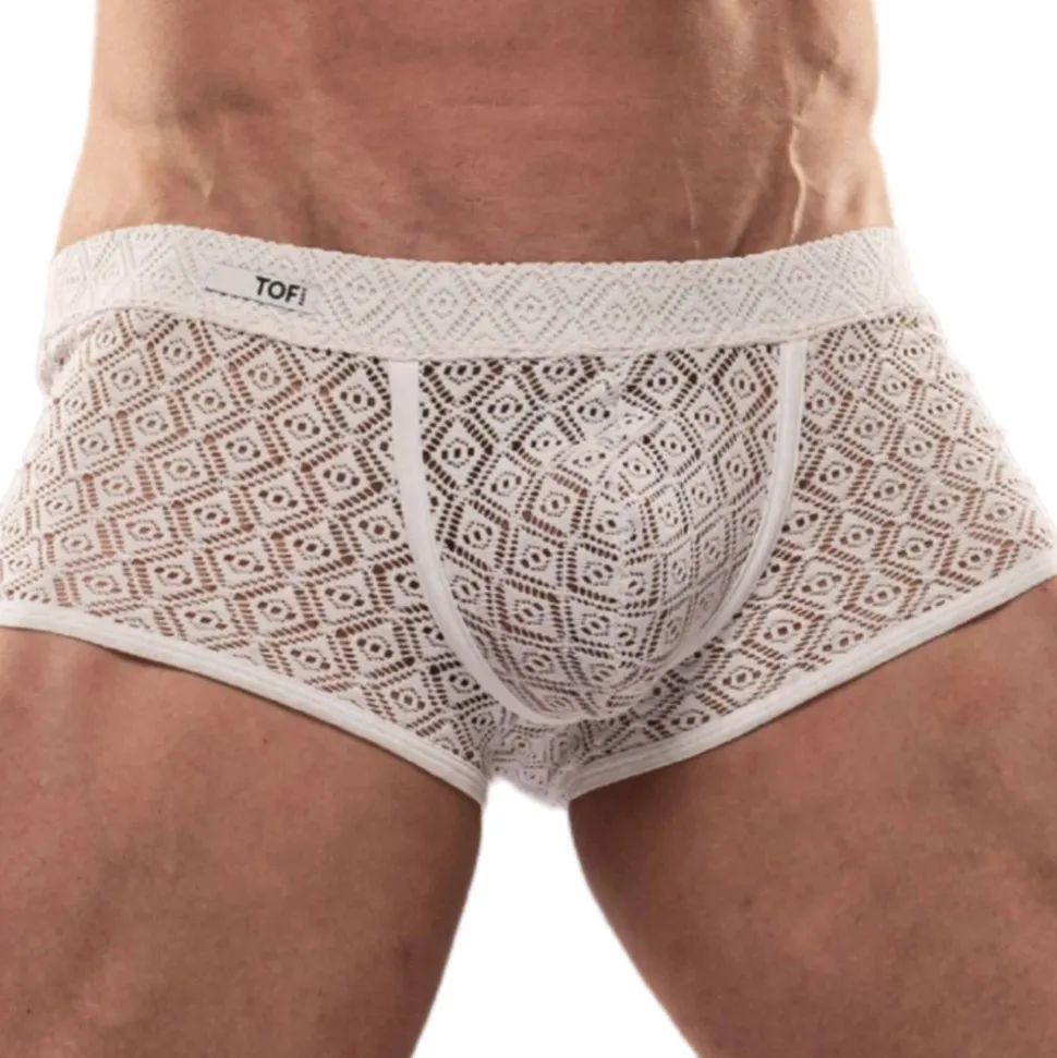 Boxer court, audacieux et élégant en dentelle semi-transparente décorée d’un motif géométrique. Coupe taille basse. Poche frontale non doublée. Ceinture élastique recouverte signée TOF Paris. Fabrication française.