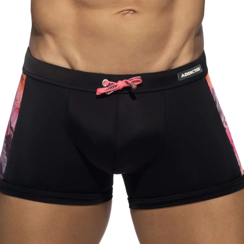Boxer de bain sexy en microfibre extensible, légère et respirante. Coupe taille basse et ajustée. Imprimé coloré sur les côtés. Ceinture élastique avec cordon de serrage. Système Pack Up intégré avec mousse amovible pour mettre en valeur votre masculinité. Etiquette logo AD en silicone sur la hanche gauche.