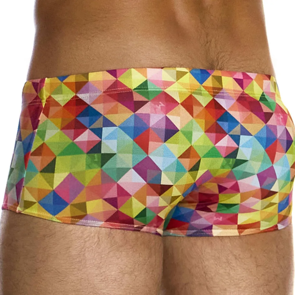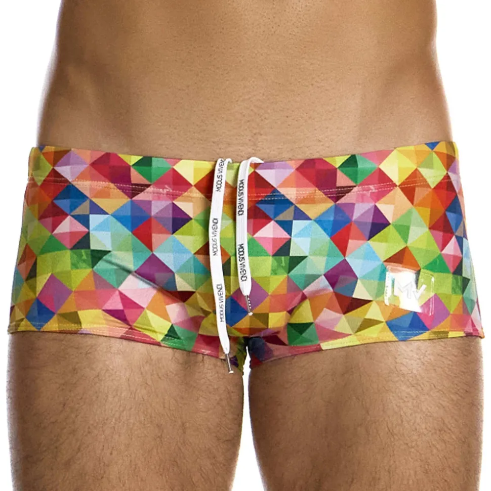 Boxer de bain en microfibre séchant rapidement et résistant aux UV. Matière recyclée à partir de bouteilles en plastique. Imprimé géométrique aux couleurs de l’arc-en-ciel. Etiquette MV en silicone sur la hanche gauche. Entièrement doublée devant. Ceinture élastique recouverte avec cordon de serrage intérieur.