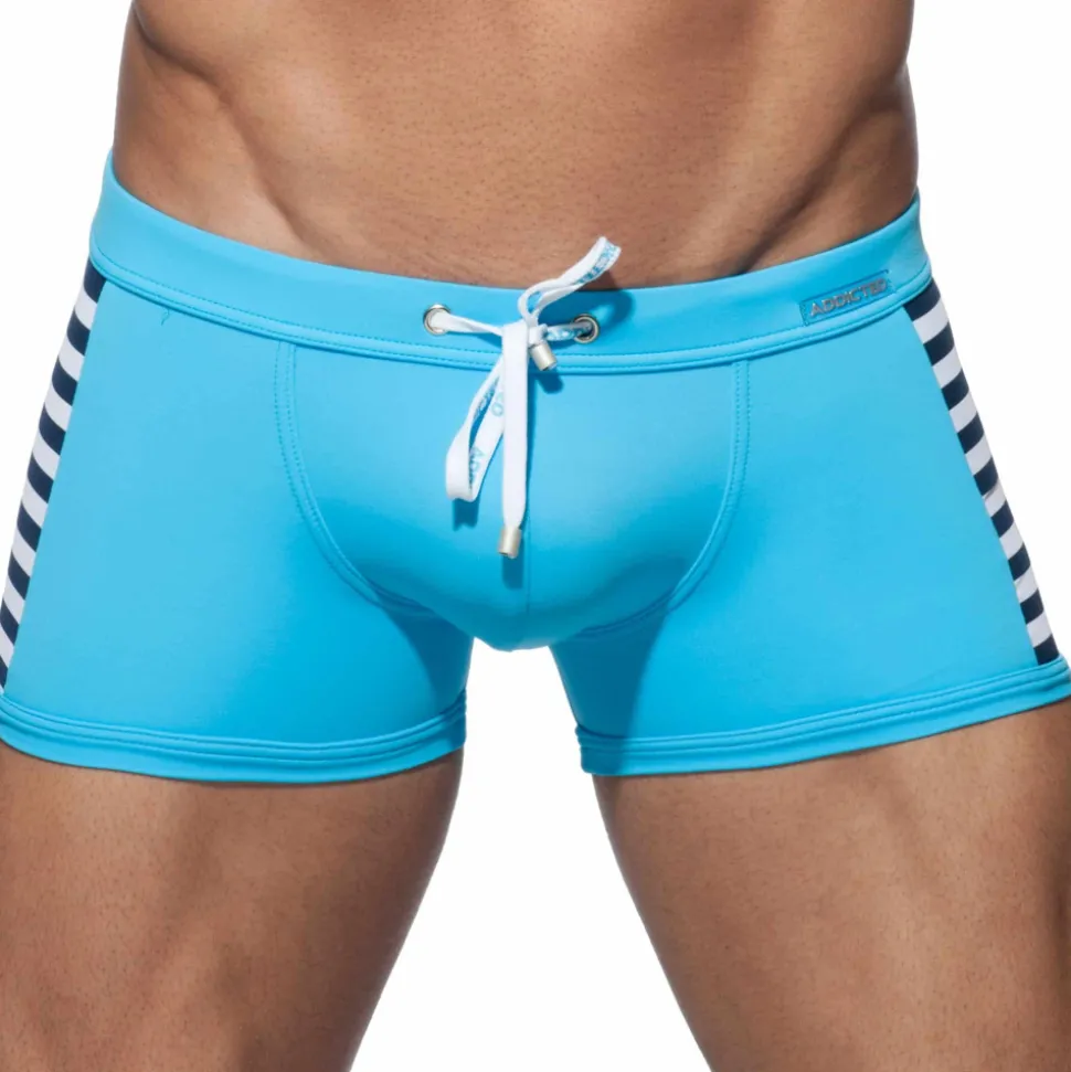 Boxer de bain taille basse, sexy et ajusté. Rayures façon marinière sur les côtés. Système Pack Up amovible. Logo Addicted cousu sur la ceinture élastique. Cordon de serrage de couleur contrastée.