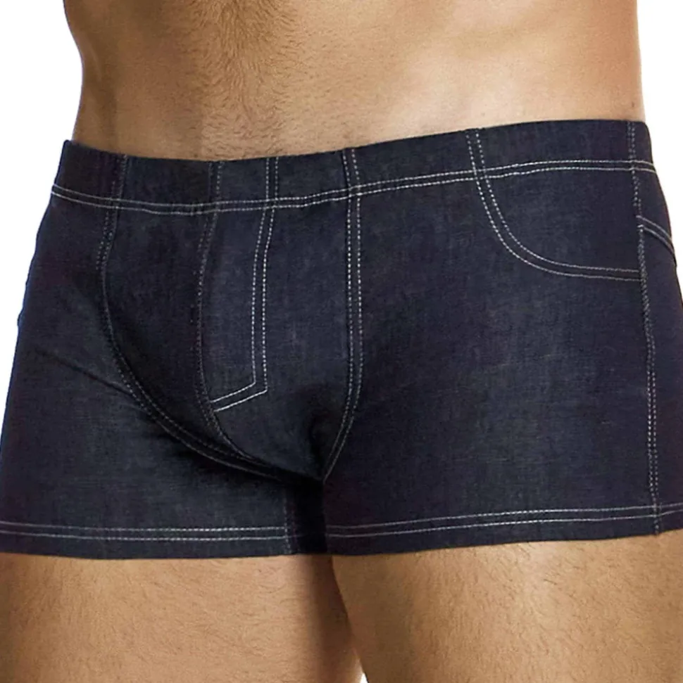Boxer taille basse original en véritable jean stretch brut. Surpiqûres contrastées. Braguette et poches factices. Ceinture élastique recouverte. Etiquette Modus Vivendi argentée cousue à l’arrière. Note : la couleur s’estompe à l’usage. Laver séparément.