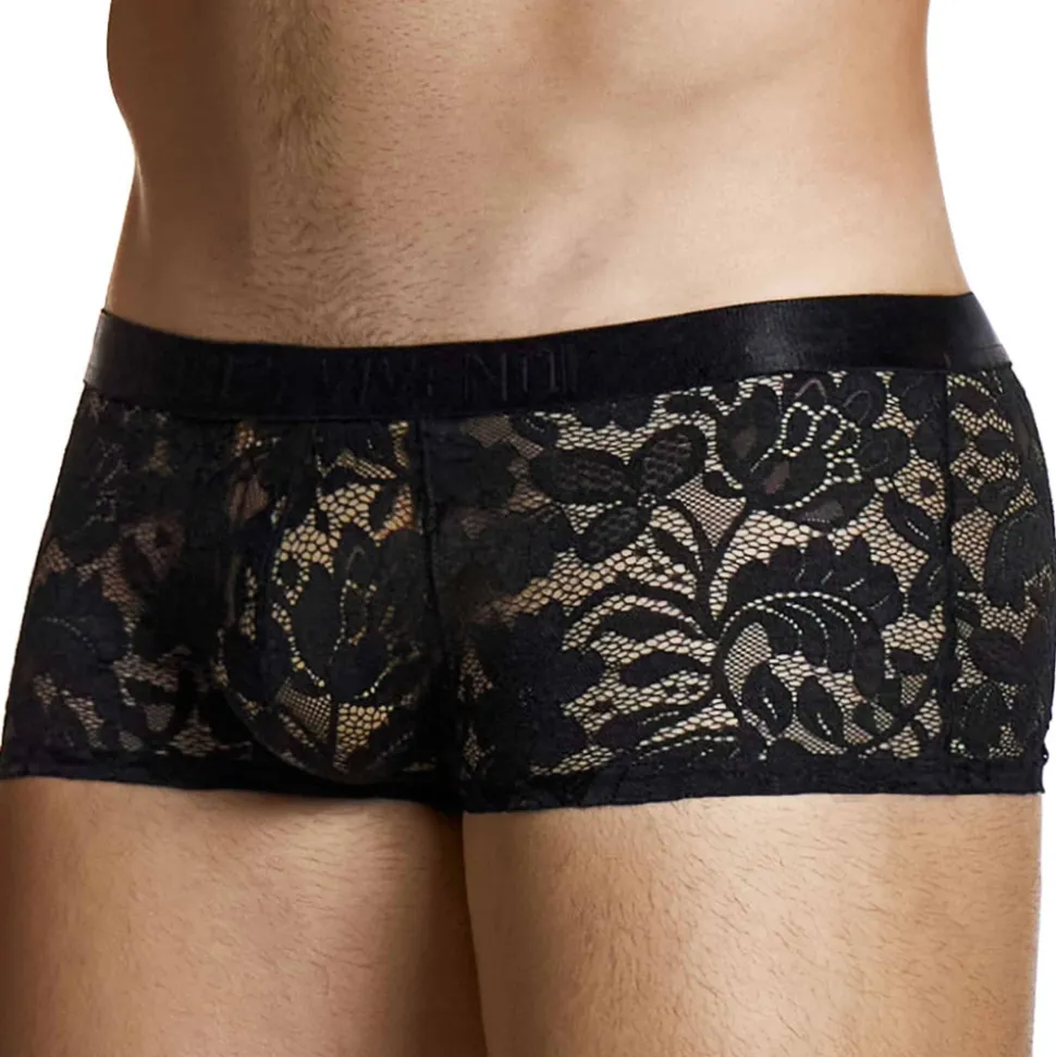 Boxer semi-transparent en dentelle extensible décorée d’un motif floral. Coupe courte, taille basse et très sexy. Poche frontale non doublée. Ceinture élastique fine signée Modus Vivendi.