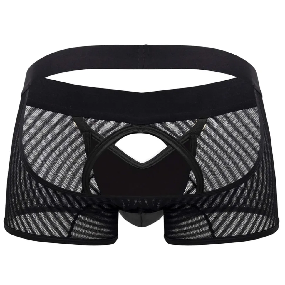 Boxer sexy et provocant en résille rayée transparente. Poche frontale opaque qui s’ouvre grâce à 2 crochets métalliques. Découpe sur les fesses pour une totale liberté de mouvement.