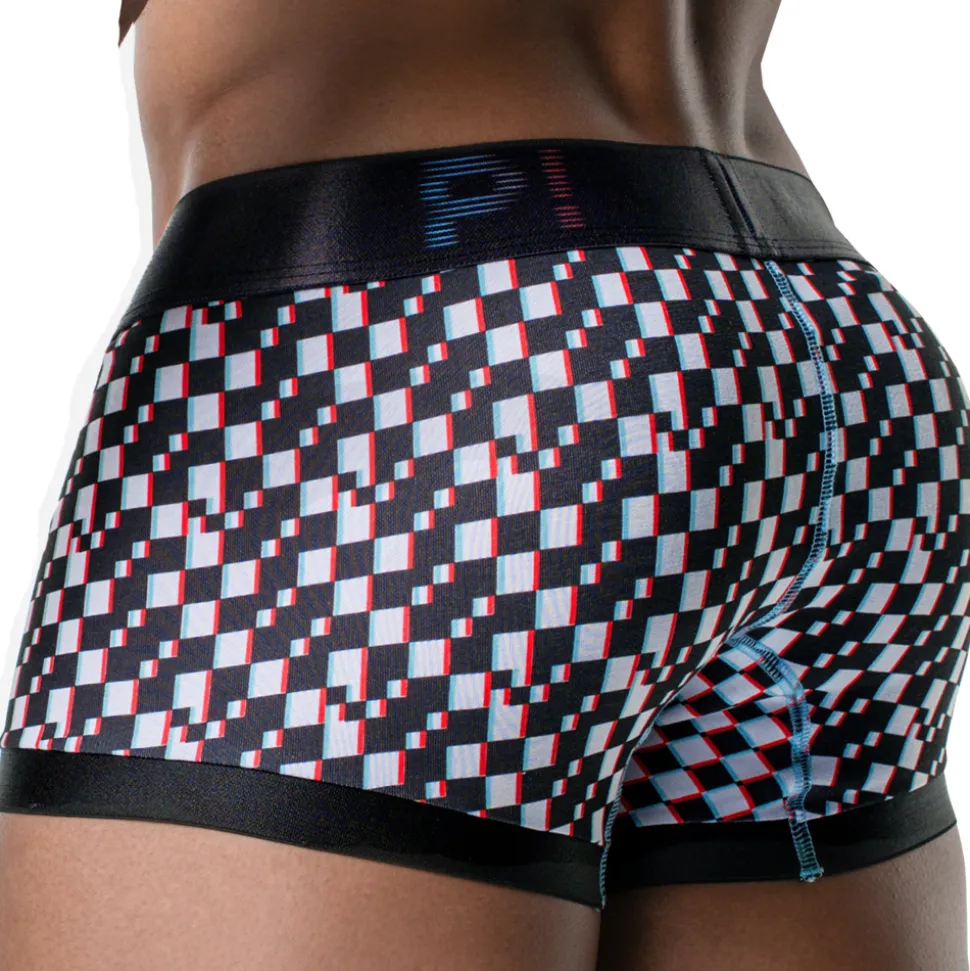 Boxer en coton CoolTouch offrant une sensation de fraîcheur au contact de la peau. Tissu doux et extensible pour un confort optimal. Imprimé à carreaux noir et blanc rappelant les pixels d’un écran. Détails de couleur contrastée. Poche frontale doublée Ceinture élastique signée Pump!.