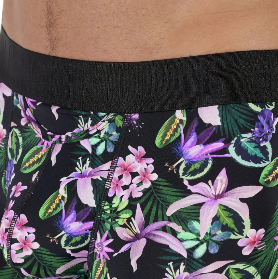 Boxer taille basse en microfibre extensible ultra douce et confortable. Imprimé floral rose et vert sur fond noir. Ouverture horizontale HO1 brevetée – aussi pratique pour les droitiers que pour les gauchers. Ceinture élastique signée HOM.