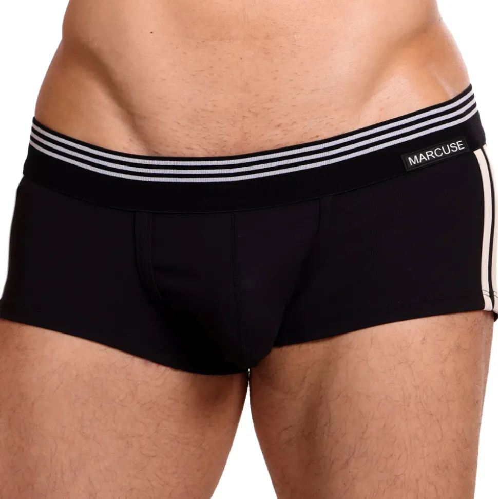 Boxer confortable en microfibre extensible, ultra-douce, légère et respirante. Coupe taille basse et très ajustée. Deux bandes sport contrastées sur les côtés. Poche frontale préformée, non doublée. Ceinture élastique rayée avec étiquette Marcuse en silicone sur la hanche gauche. Logo brodé sur la fesse droite.