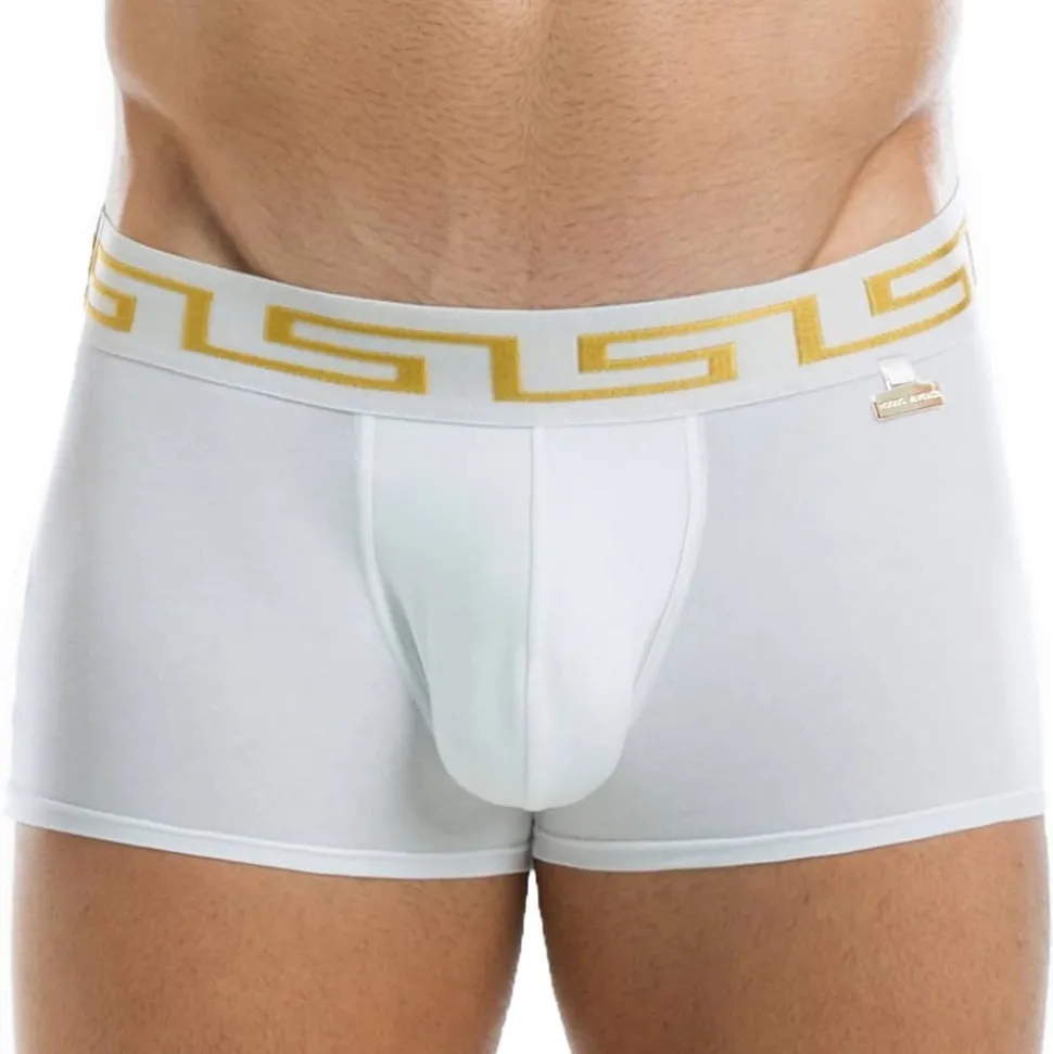 Boxer taille basse en coton doux. Poche frontale doublée pour plus de confort. Plaque métallique Modus Vivendi sur la hanche gauche. Motif inspiré par la Grèce antique sur la ceinture élastique.