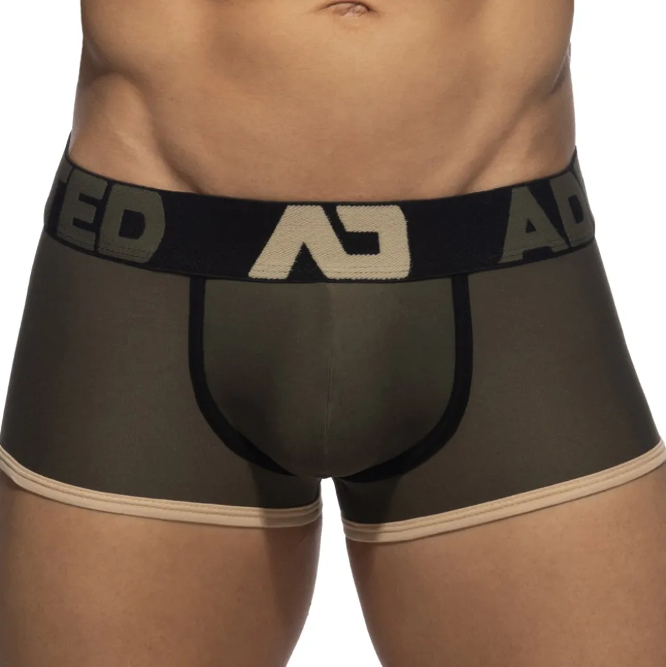 Boxer court en mélange doux et souple de microfibre et de coton. Coupe taille basse et ajustée. Grande poche frontale push up pour un excellent maintien et une valorisation naturelle de votre masculinité. Bordures de couleur contrastée. Large ceinture élastique signée Addicted.