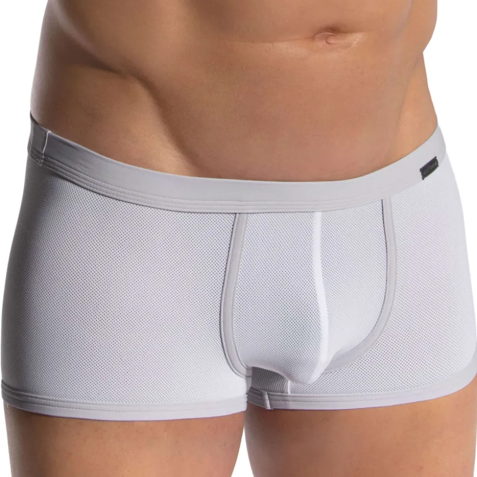 Boxer court en micro-mesh respirant, ultra extensible et confortable. Poche frontale préformée, non doublée. Détails de couleur contrastée. Ceinture élastique avec étiquette Olaf Benz.