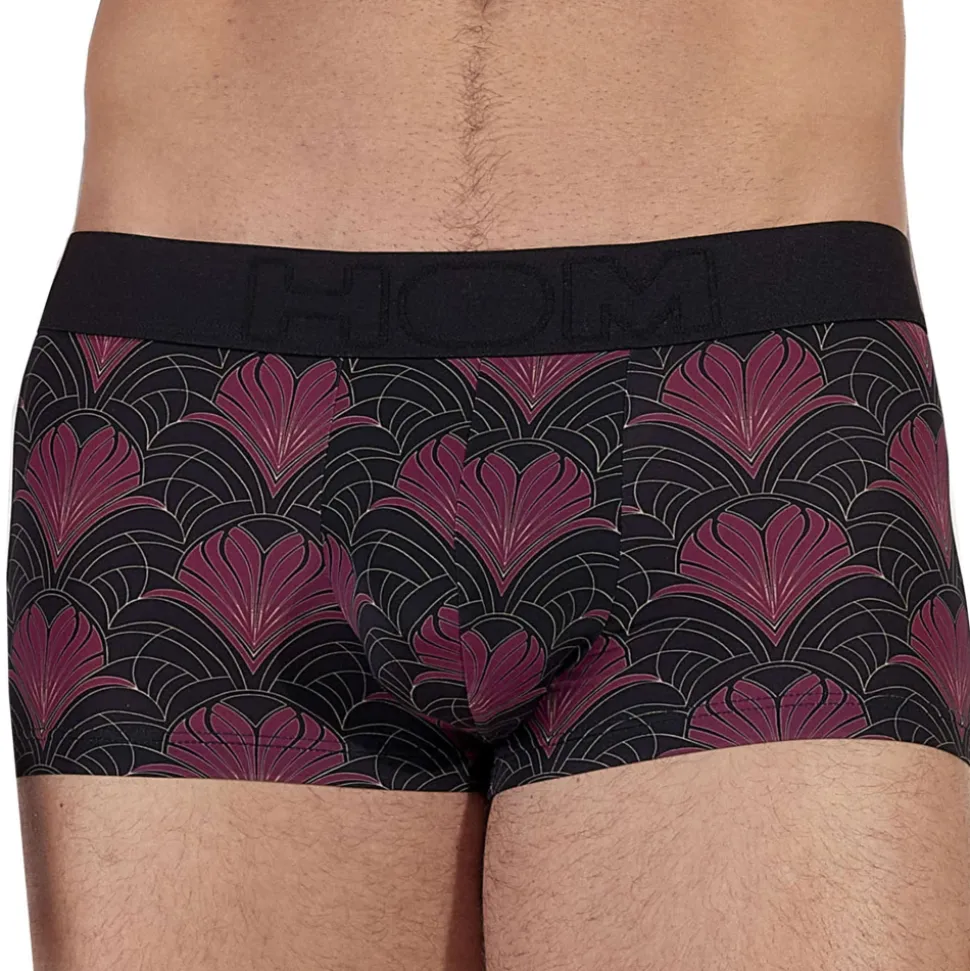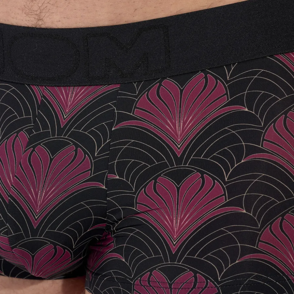 Boxer chic en microfibre extensible, douce et confortable. Imprimé floral d’inspiration Art Déco dans les tons bordeaux sur un fond noir. Tissu de qualité supérieure certifié Oeko-Tex. Poche frontale doublée. Nouvelle ceinture élastique thermo soudée sans couture, pour plus de confort et de douceur.