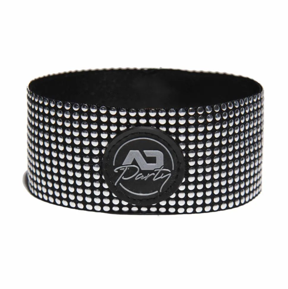 Brassard sexy et original constitué d’une large bande élastique recouverte de picots argentés apportants des reflets métalliques scintillants. Logo AD Party en silicone. Vendu à l’unité.