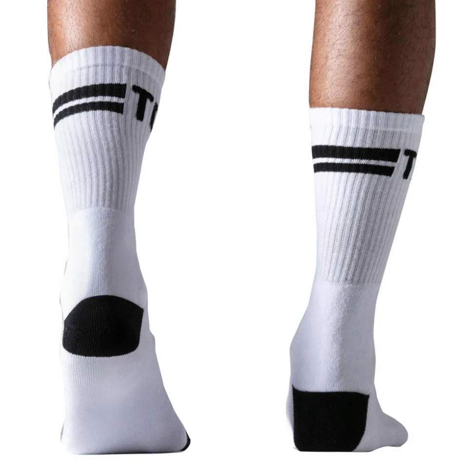 Paire de chaussettes de sport mi-mollet en coton mélangé. Logo TOF sur la cheville. Talon et pointe contrastés. Plante des pieds renforcée. Taille S/M pour une pointure 39 à 42. L/XL: 43 à 46.