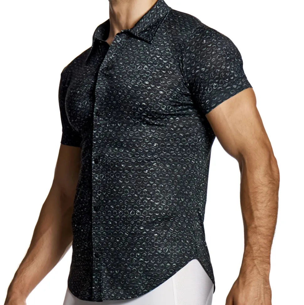 Chemise audacieuse en microfibre douce au toucher velouté et soyeux. Son imprimé original en trompe-l’œil crée une surprenante illusion de papier bulle. Coupe cintrée, arrondie en bas pour un tombé parfait sur un jean ou un short. Manches courtes. Fermeture 6 boutons. Etiquette Modus Vivendi en silicone en haut du dos.
