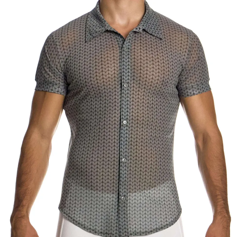 Chemisette sexy et originale en résille fine, légère et semi-transparente. Impression en trompe-l’œil créant l’illusion d’un tissu tricoté. Coupe cintrée, arrondie en bas pour un tombé parfait sur un jean ou un short. Fermeture par 6 boutons. Etiquette Modus Vivendi en silicone en haut du dos.