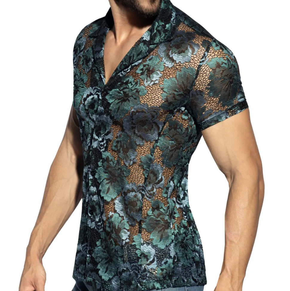 Chemise luxueuse en dentelle transparente décorée d’un délicat motif floral dans les tons verts et bleus. Coupe courte et arrondie en bas, pour tomber parfaitement sur un pantalon. Manches courtes. Fermeture 5 boutons. Logo ES Collection en silicone au dos.