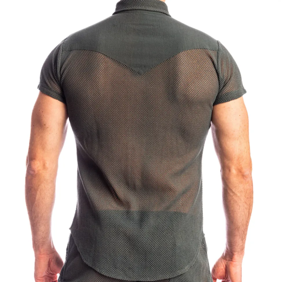 Chemise en résille de coton transparente. Coupe cintrée arrondie en bas. Manches courtes. Patte de boutonnage invisible. Empiècement opaque en haut du dos avec logo L’homme Invisible.