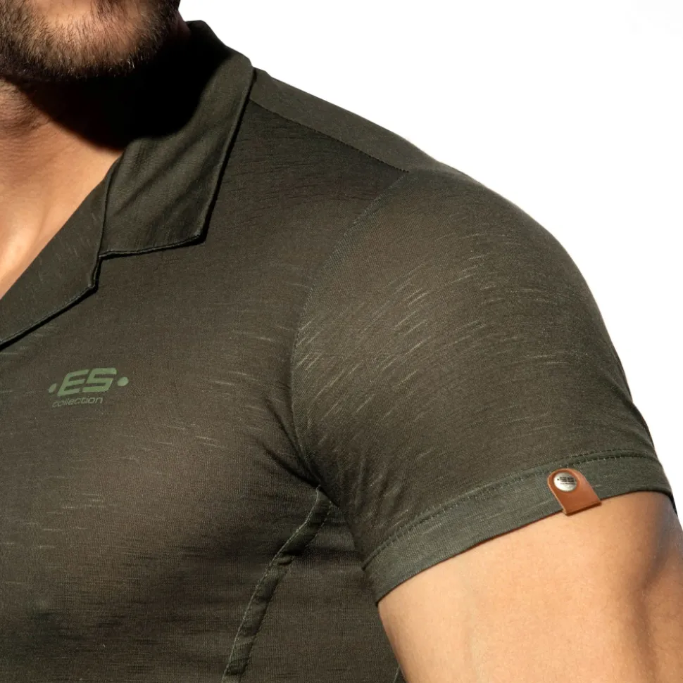 Chemisette en microfibre fine, légère et respirante de couleur unie. Coupe cintrée très ajustée. Fermeture 5 boutons. Epingle métallique sur la manche gauche. Logo ES Collection sur la poitrine.