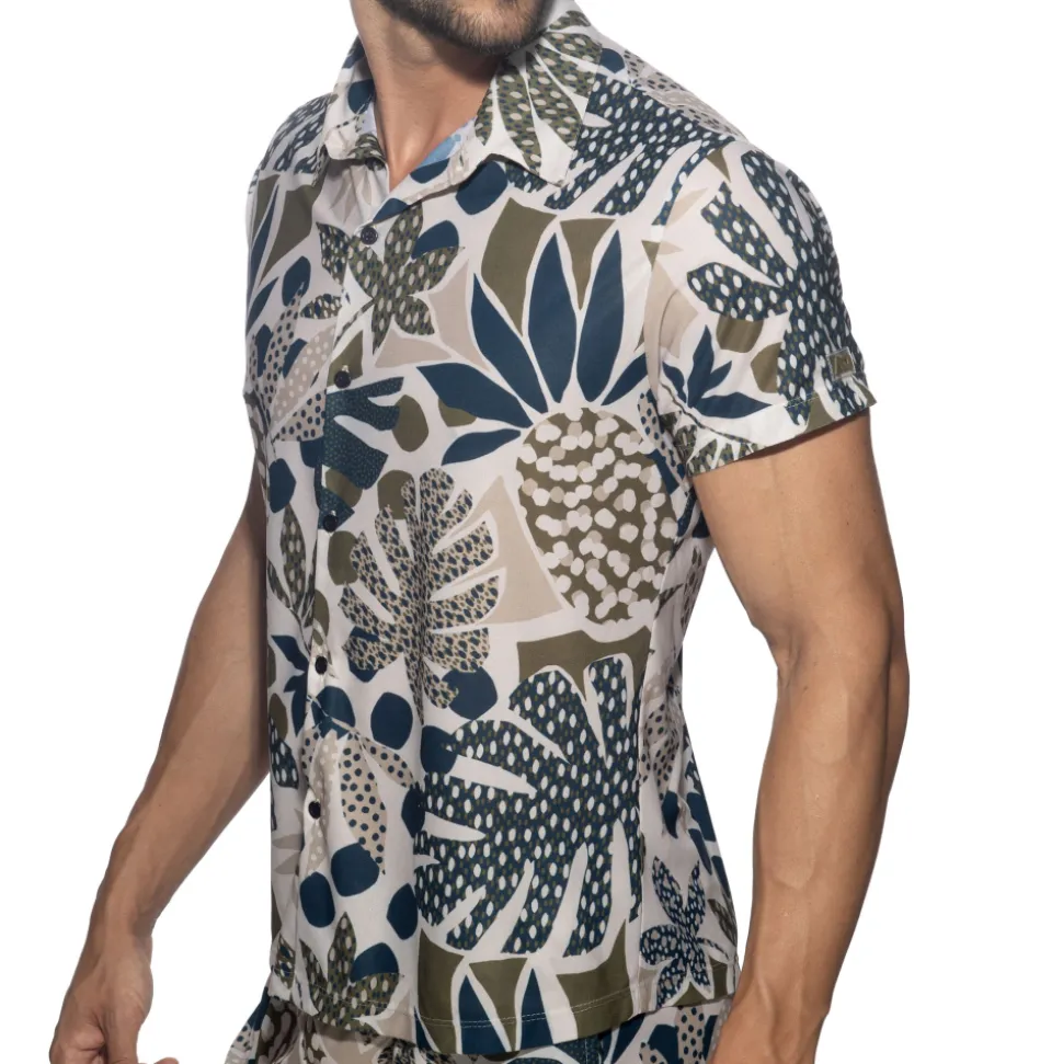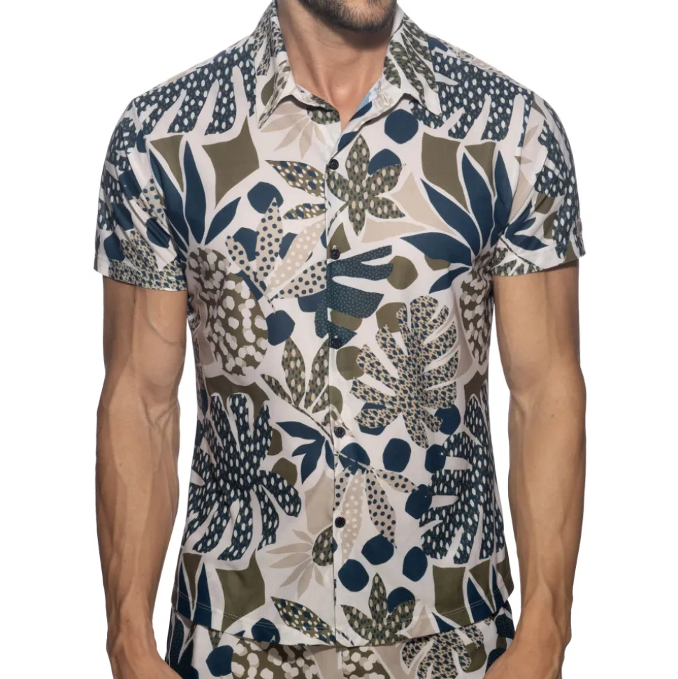 Chemise cintrée en microfibre respirante, douce et ultra légère. Imprimé tropical dans les tons kaki et bleu sur fond beige. Manches courtes. Fermeture 6 boutons. Etiquette AD en silicone sur la manche gauche.