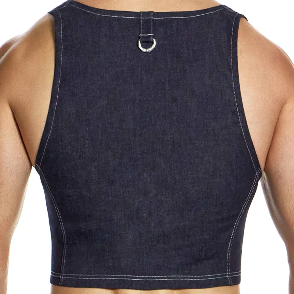 Débardeur sexy et original en véritable jean stretch brut. Coupe raccourcie pour dévoiler vos abdos. Bretelles ajustables grâce à 2 boutons métalliques. Surpiqûres contrastées. Languette avec boucle métallique dans le dos. Etiquette Modus Vivendi argentée cousue sur la gauche. Note : la couleur s’estompe à l’usage. Laver séparément.
