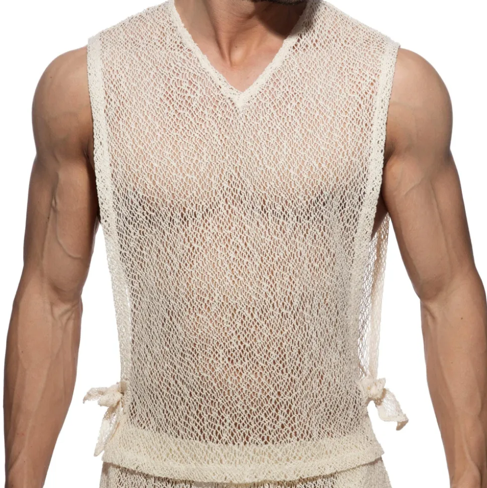 Débardeur col V en maille ultra légère et respirante à base de coton. Le tissu à motif bohémien dévoile le corps en transparence. Coupe originale, entièrement ouverte sur les côtés, avec cordons se serrage pour attacher les parties avant et arrière. Logo AD en silicone dans le dos.