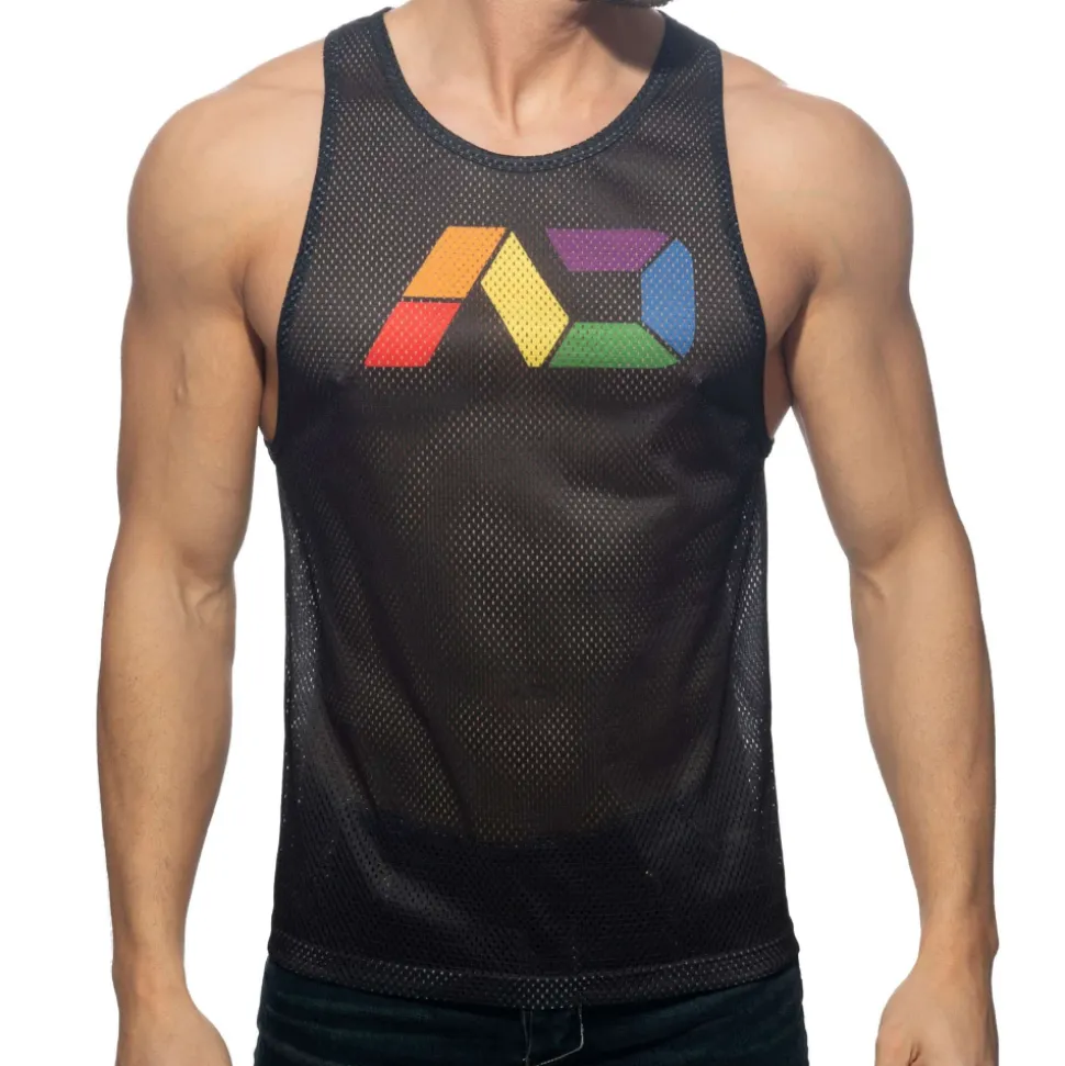 Débardeur en mesh sport ajouré. Larges ouvertures sur les côtés. Logo Addicted arc-en-ciel imprimé sur la poitrine et étiquette en silicone dans le dos. Fabriqué à Barcelone.