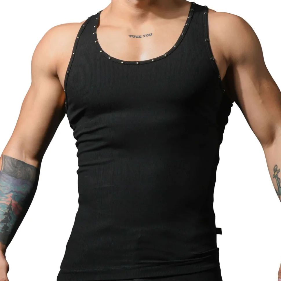 Débardeur en mélange à base de coton côtelé, doux et confortable. Coupe très près du corps, pour mettre en valeur votre musculature. Col rond et emmanchures bordés de clous métalliques.