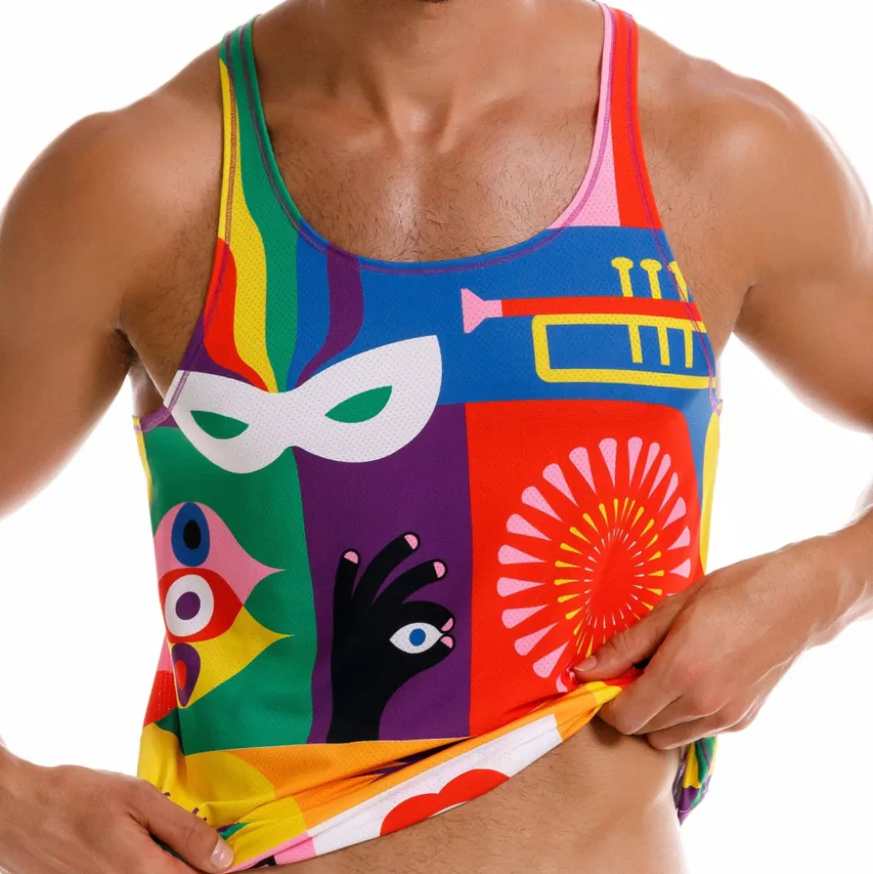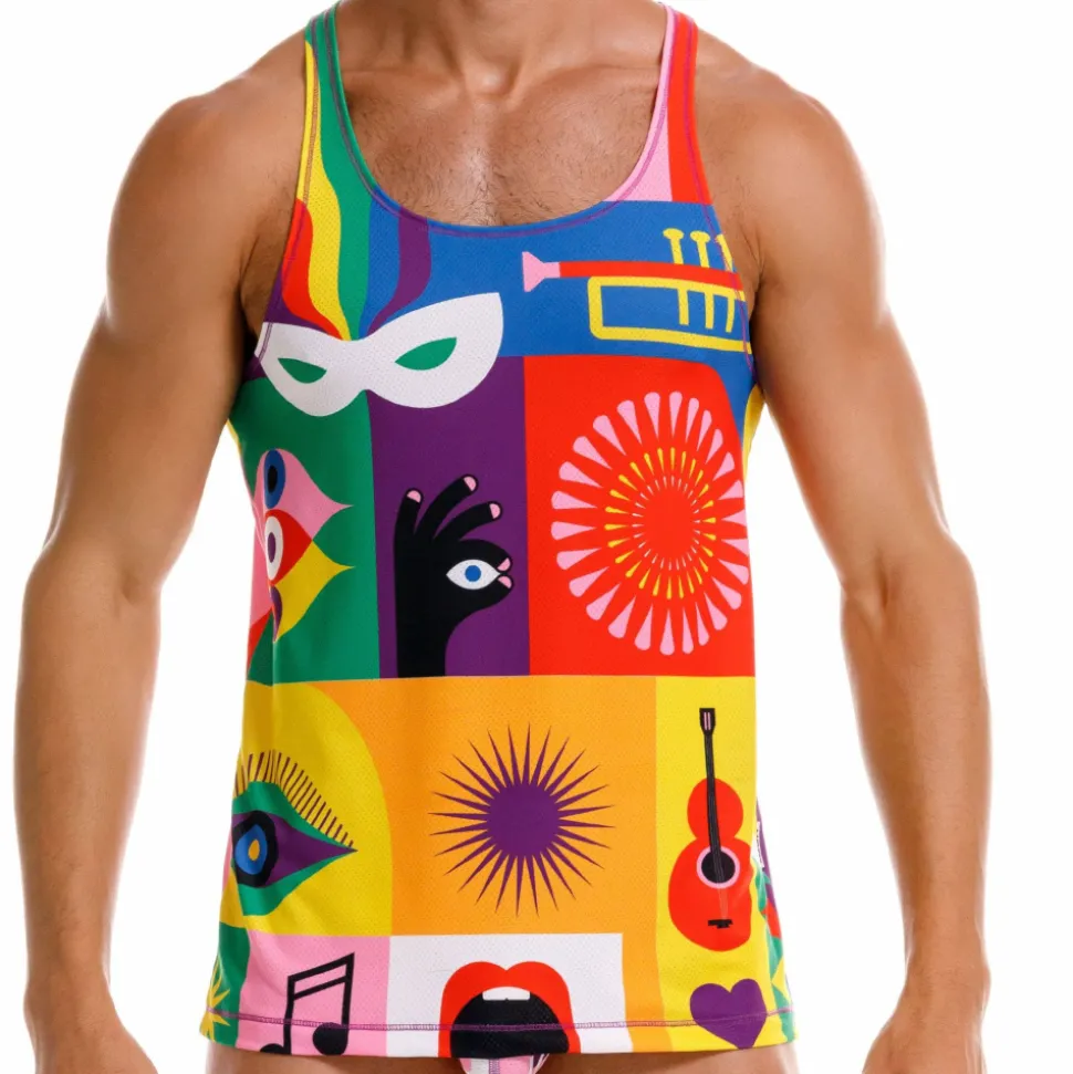 Débardeur en microfibre extensible, super douce et légère. Imprimé festif évoquant le carnaval.
