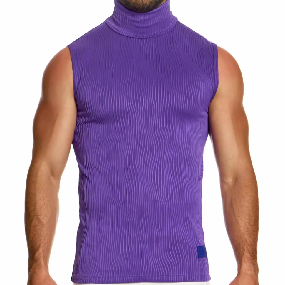 Débardeur luxueux et futuriste en microfibre extensible super douce. Motif jacquard texturé et ondulé. Col roulé. Logo Modus Vivendi à la taille.
