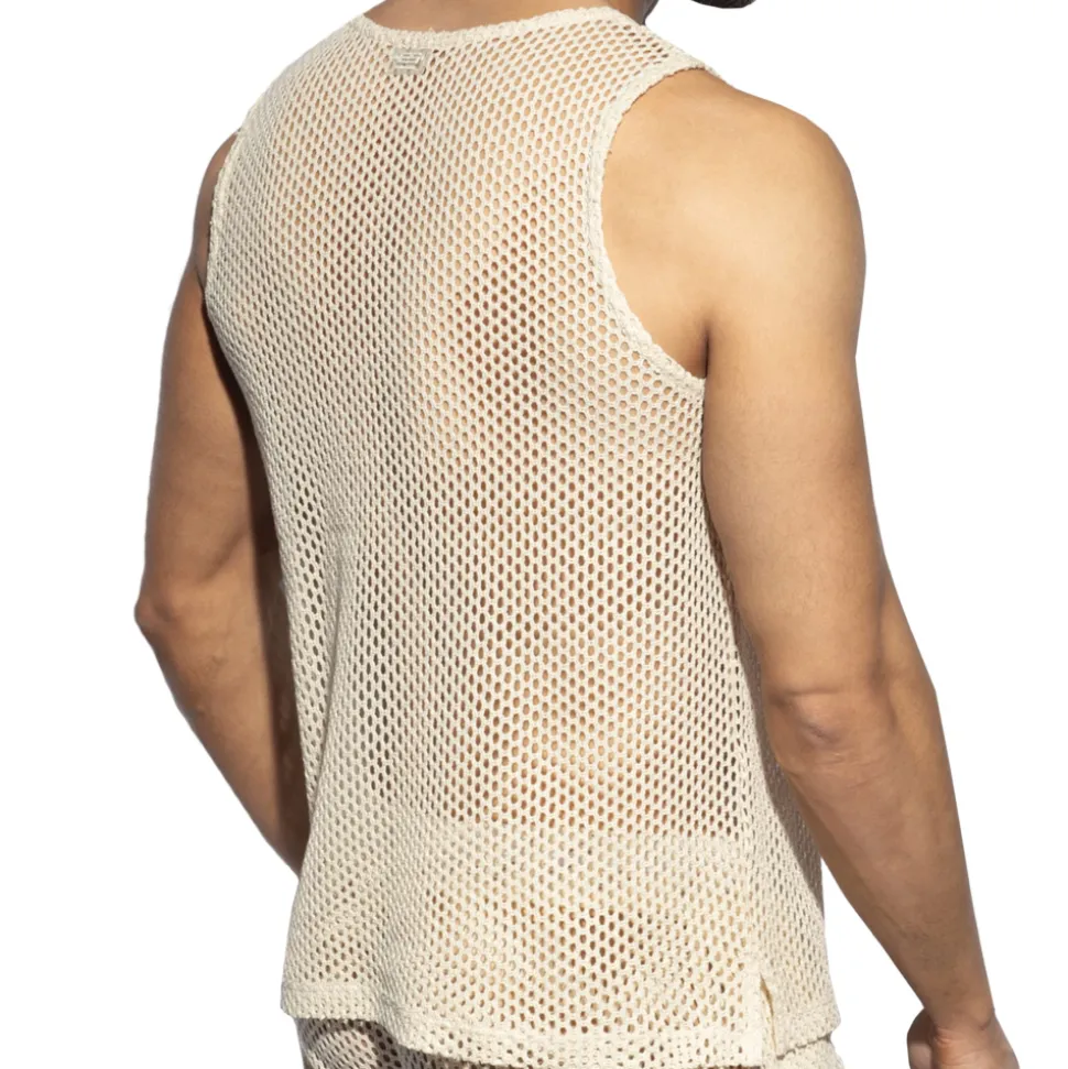 Débardeur en crochet épais et transparent. Tissu tricoté, confortable et luxueux, en pur coton. Col rond. Logo ES Collection en silicone au dos.
