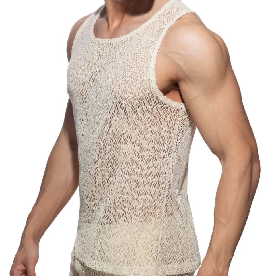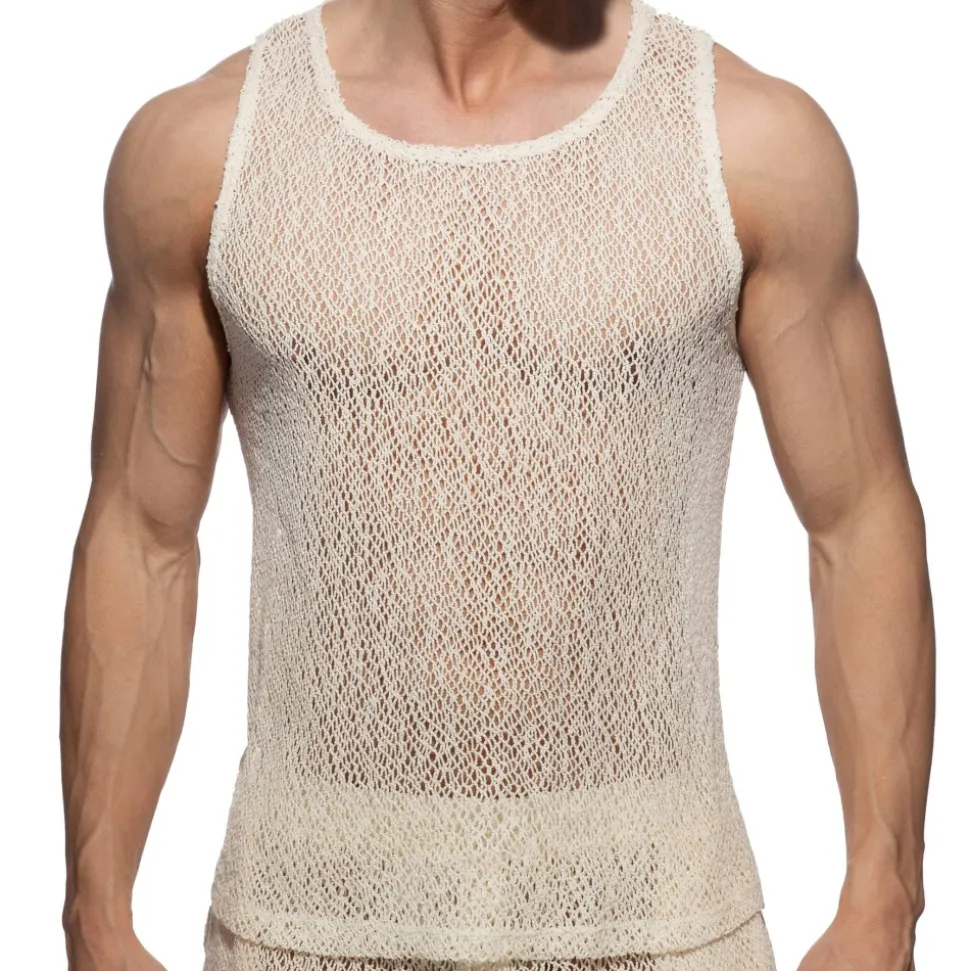 Débardeur en maille ultra légère et respirante à base de coton. Le tissu à motif bohémien dévoile le corps en transparence. Coupe chic et décontractée. Col rond. Logo AD en silicone dans le dos.