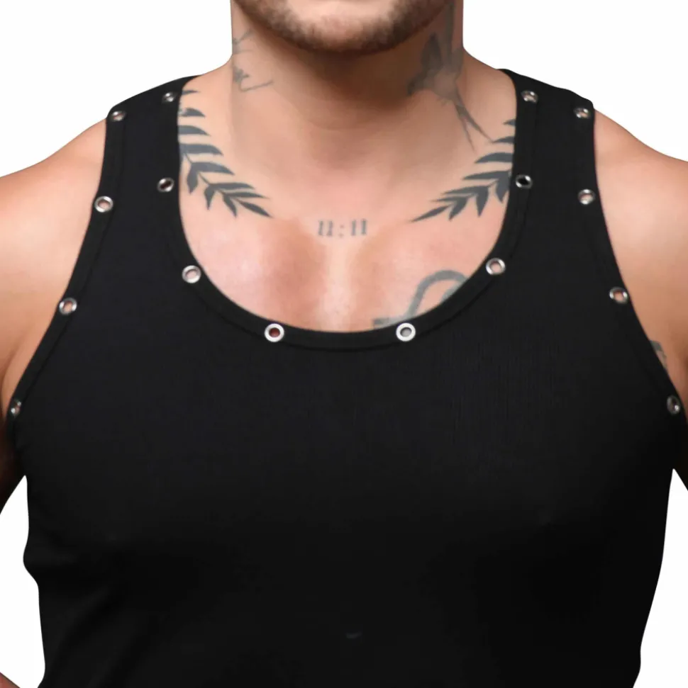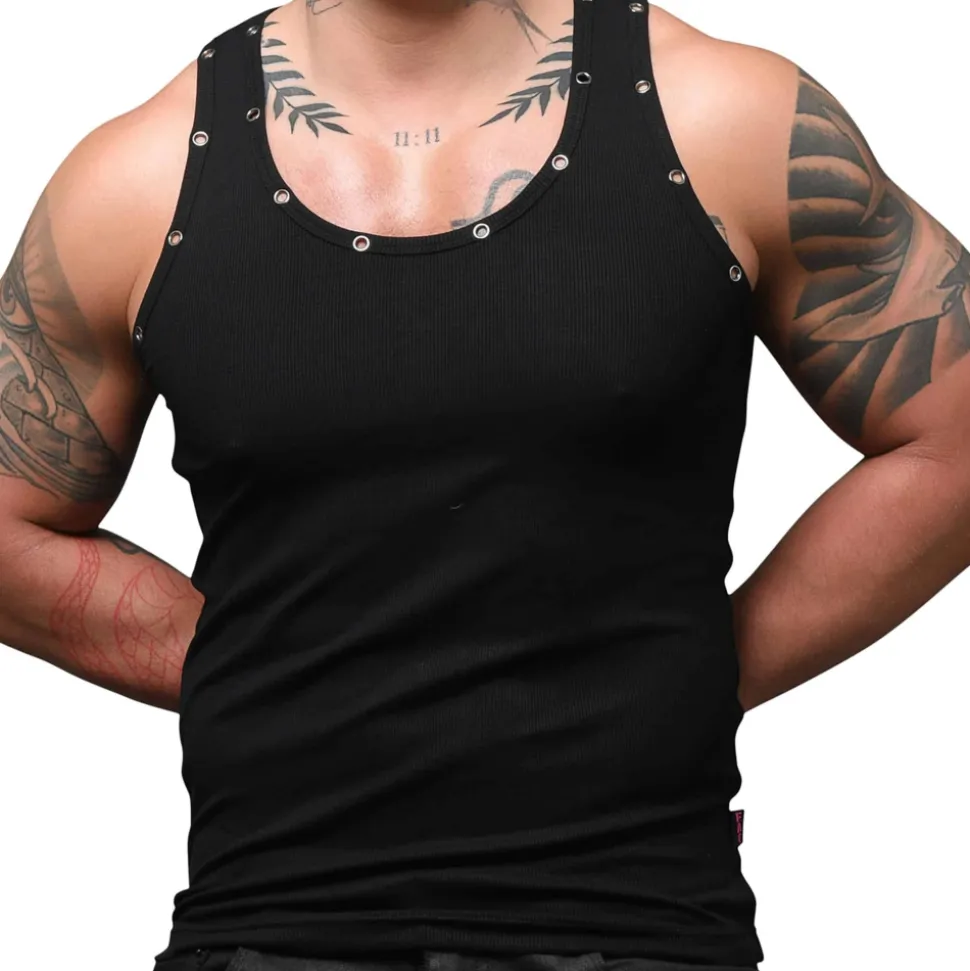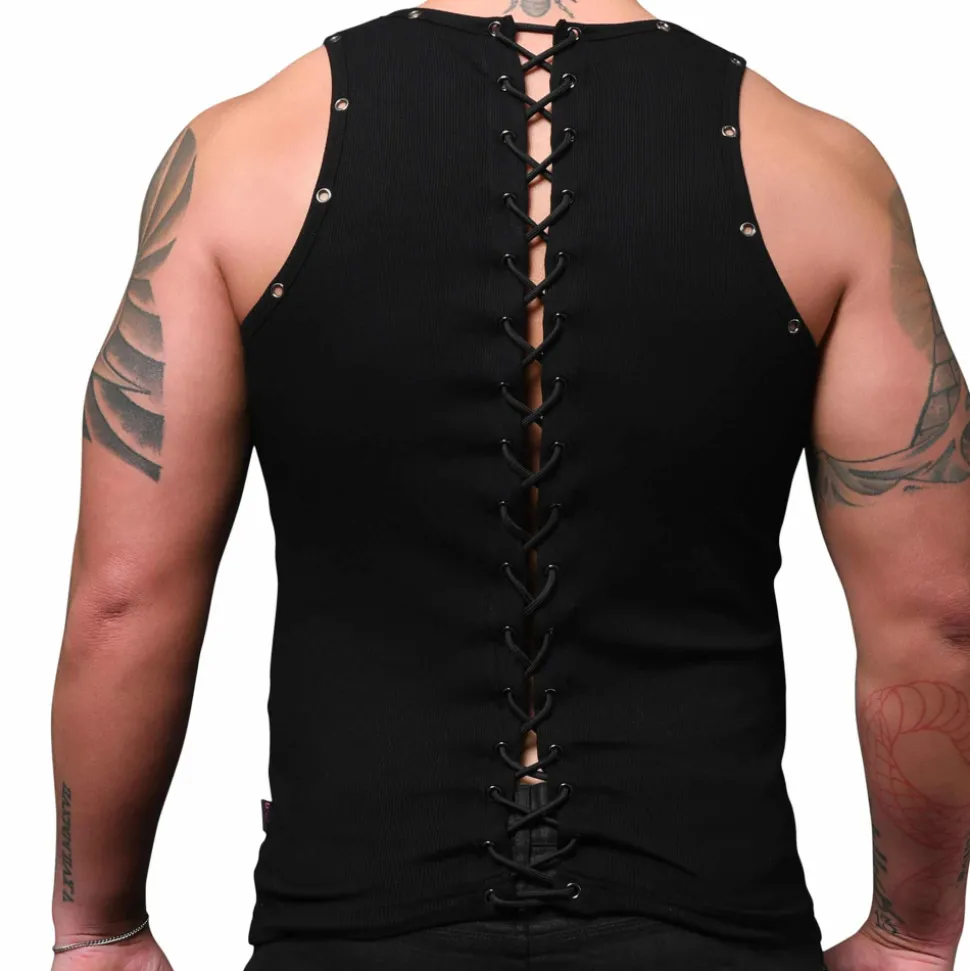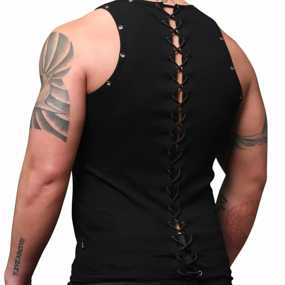 Débardeur original en viscose extensible, côtelée, douce et respirante. Oeillets métalliques et laçage intégal au dos pour un look bondage audacieux. Edition Limitée.