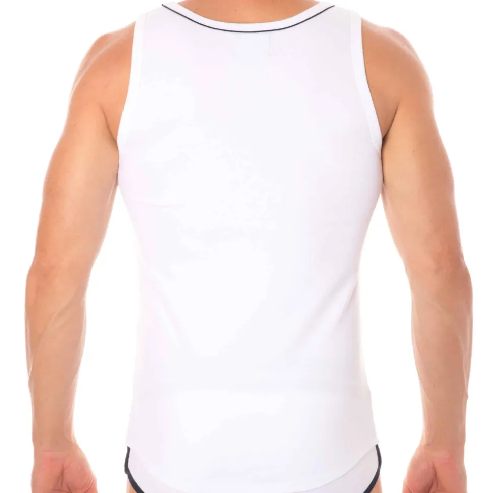 Débardeur sport et sexy en coton premium doux et extensible de couleur intense. Cintré juste comme il faut, il valorisera votre musculature sans gêner vos mouvements. Coupe courte et arrondie en bas, pour tomber parfaitement sur un pantalon. Le col rond est subtilement souligné par un liseré de couleur contrastée. Logo SKU sur la poitrine.