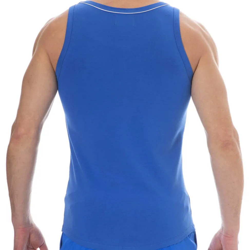 Débardeur sport et sexy en coton premium doux et extensible de couleur intense. Cintré juste comme il faut, il valorisera votre musculature sans gêner vos mouvements. Coupe courte et arrondie en bas, pour tomber parfaitement sur un pantalon. Le col rond est subtilement souligné par un liseré de couleur contrastée. Logo SKU sur la poitrine.