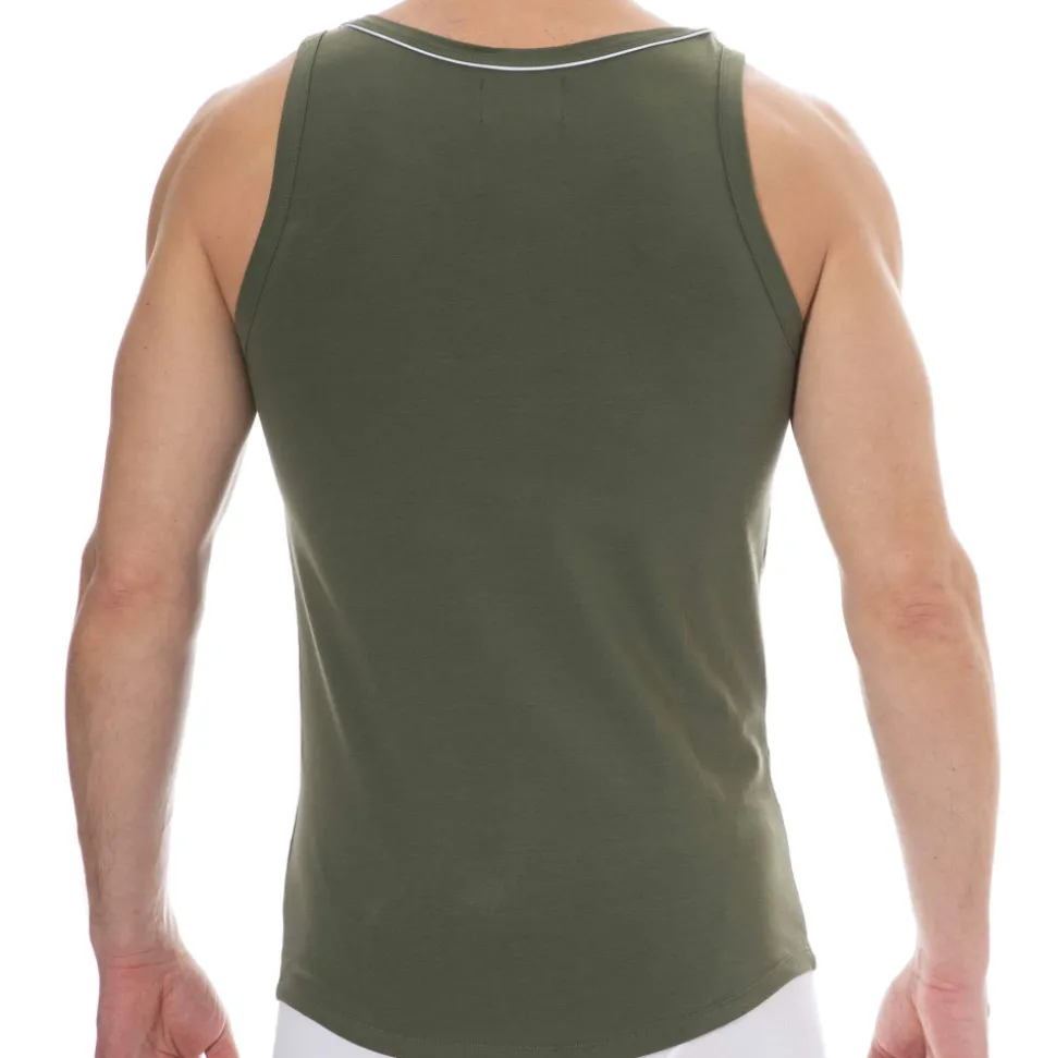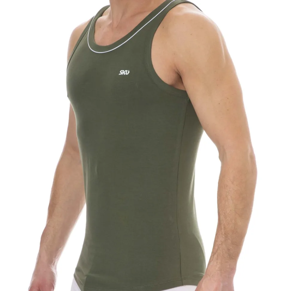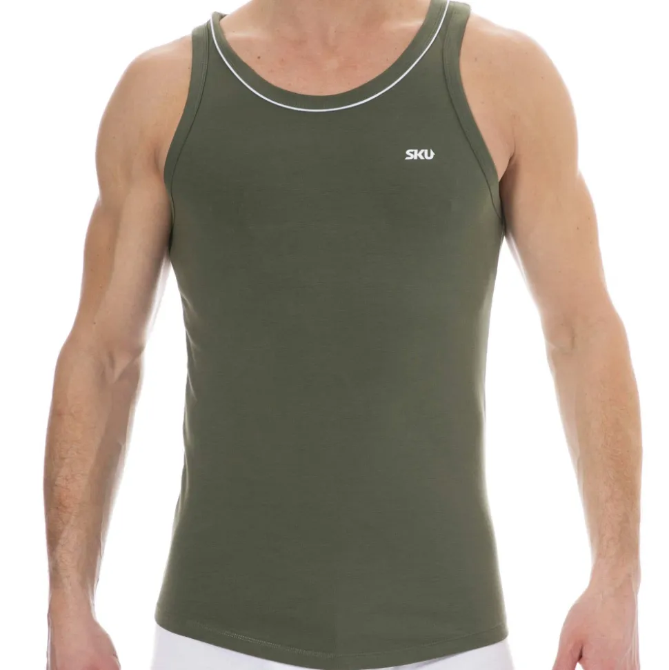 Débardeur sport et sexy en coton premium doux et extensible de couleur intense. Cintré juste comme il faut, il valorisera votre musculature sans gêner vos mouvements. Coupe courte et arrondie en bas, pour tomber parfaitement sur un pantalon. Le col rond est subtilement souligné par un liseré de couleur contrastée. Logo SKU sur la poitrine.